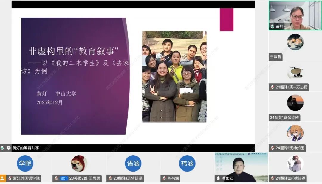 近日,浙外博达论坛第1097讲暨英文同文讲坛第136讲顺利举行。中山大学中文系黄灯教授应邀作题为“非虚构里的‘教育叙事’:以《我的二本学生》《去家访》为例”的专题讲座,逾百名师生参加,英文学院文学与创作系学科专业负责人潘家云教授主持。