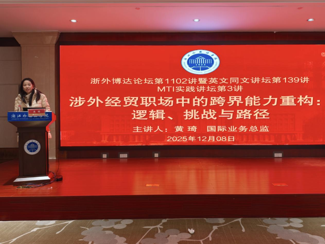 12月8日上午,2138cn太阳集团古天乐博达论坛第1102讲暨英文同文讲坛第139讲在厚德楼102顺利举行。东西方贸易有限公司海外业务总监黄琦应邀作题为“涉外经贸职场中的跨界能力重构”的讲座。英语笔译硕士研究生及部分本科生参加讲座,英文学院翻译传播系科研主管曾芳芝主持。