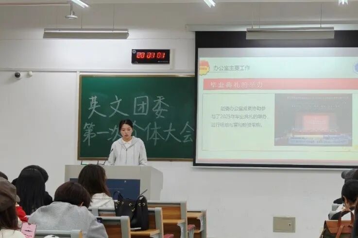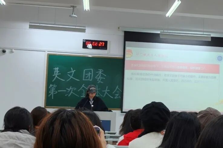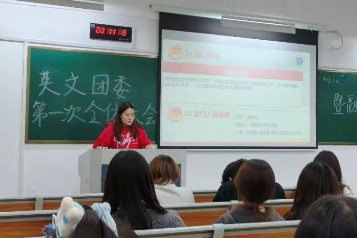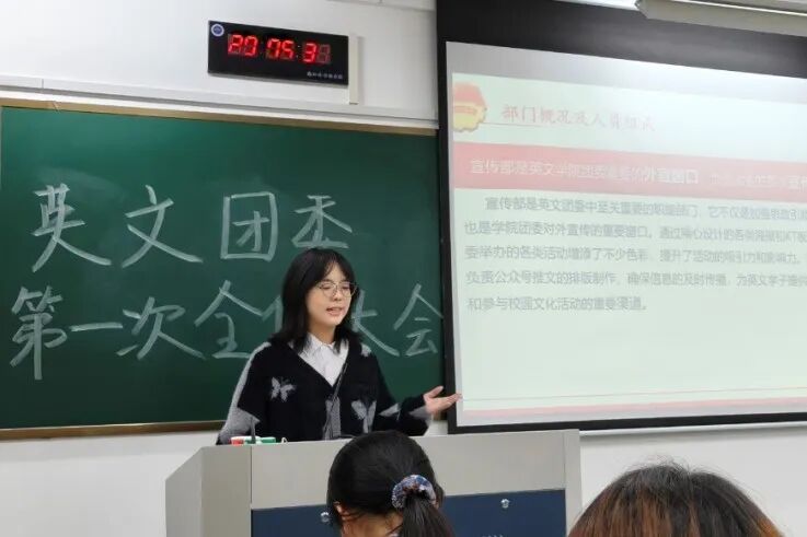 李仪婷首先简要介绍了共青团2138CC太阳集团委员会,并通过组织架构图的展示,帮助大一新生快速建立对英文学院团委的整体认知,为后续工作奠定了良好基础。