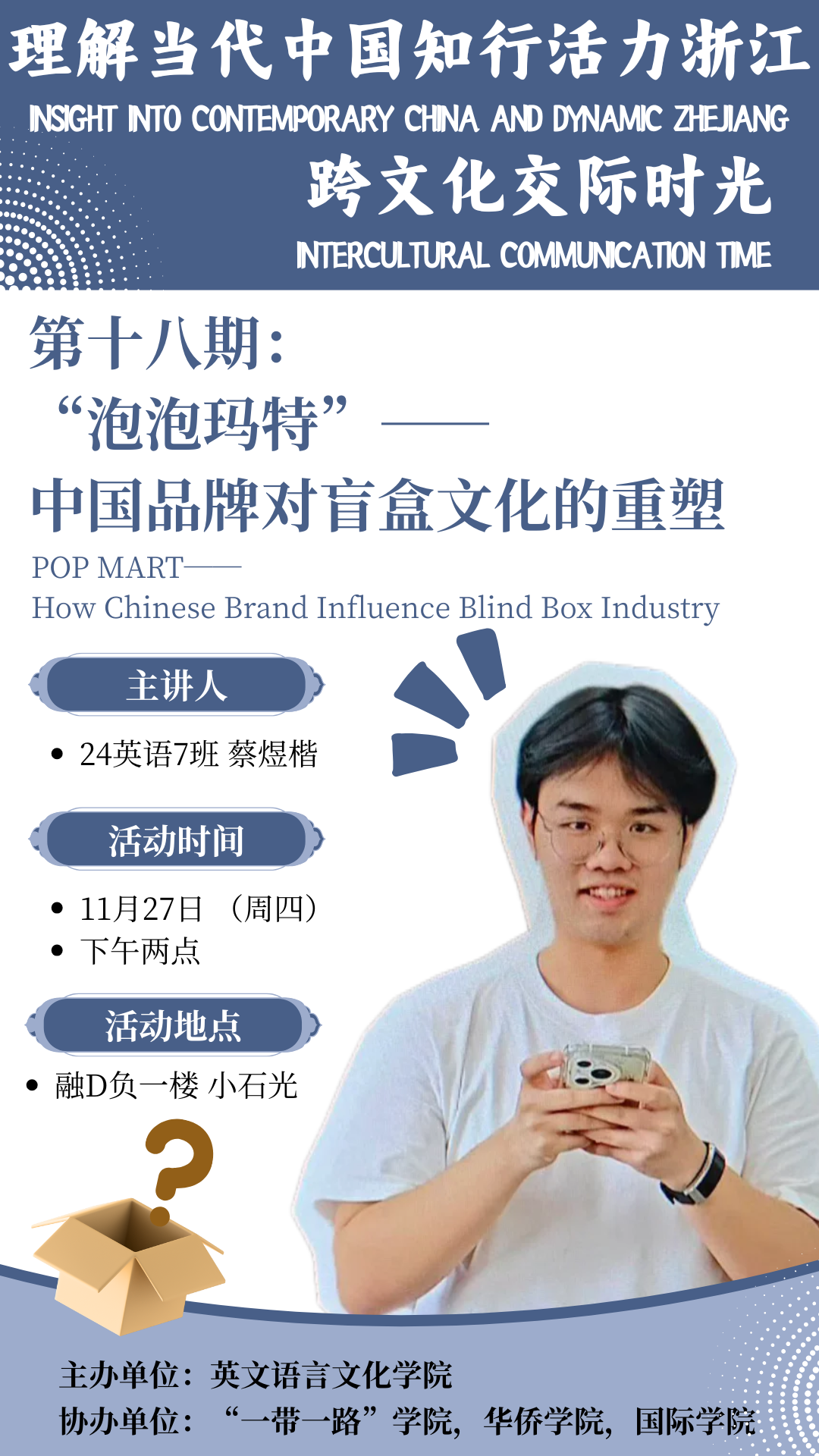 为弘扬“闻道中华,语美天下”的浙外精神,助力青年学生深入理解当代中国,知行活力浙江,讲好中国故事、浙江故事,传播好中国声音、浙江声音,英文学院将继续在校园小石光开展“跨文化交际时光”系列活动。