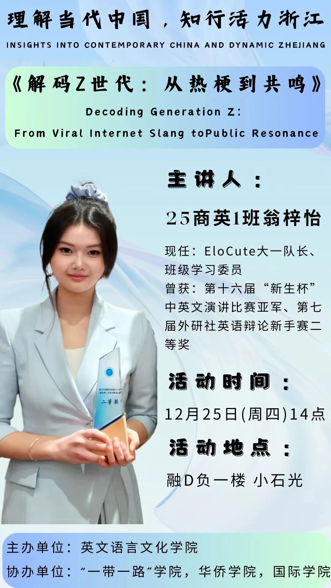 为弘扬“闻道中华,语美天下”的浙外精神,助力青年学生深入理解当代中国,知行活力浙江,讲好中国故事、浙江故事,传播好中国声音、浙江声音,英文学院将继续在校园小石光开展“跨文化交际时光”系列活动。