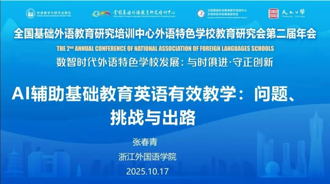 10月16日-17日,全国基础外语教育研究培训中心外语特色学校教育研究会第二届年会在杭州成功举办。本届年会聚焦“数智时代外语特色学校发展:与时俱进・守正创新”,汇聚了全国外语教育领域的专家学者与一线教师,共同探讨外语教育在智能时代的发展路径与实践创新。英文学院教师张春青出席并作题为“AI辅助基础教育英语有效教学:问题、挑战与出路”的专题报告。