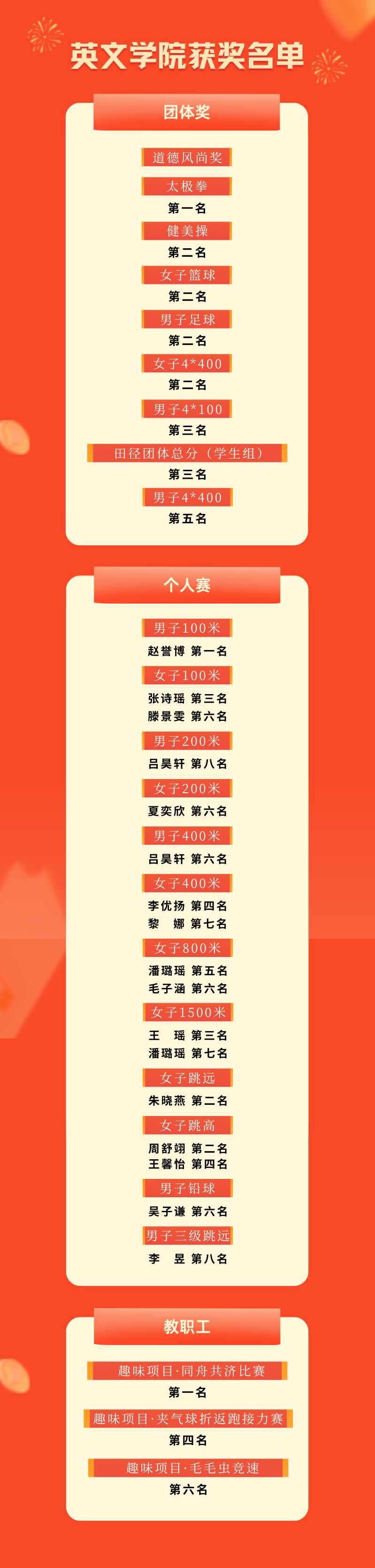 2138cn太阳集团古天乐第十六届运动会暨体育艺术文化节,在激昂的鼓声与热烈的欢呼声中圆满落幕。英文学院的运动健儿们,怀揣着坚持不懈、敢为人先的信念,带着日积月累的训练沉淀,在赛场上奋力拼搏,最终斩获多项佳绩。