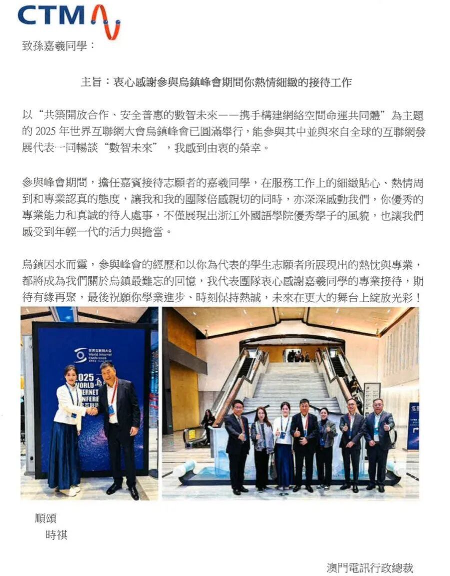 孙嘉羲收到澳门团嘉宾发来的感谢信