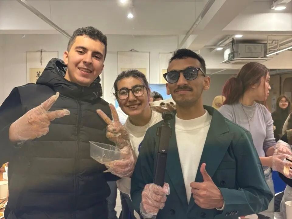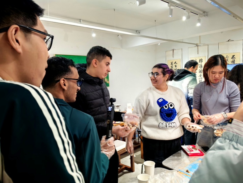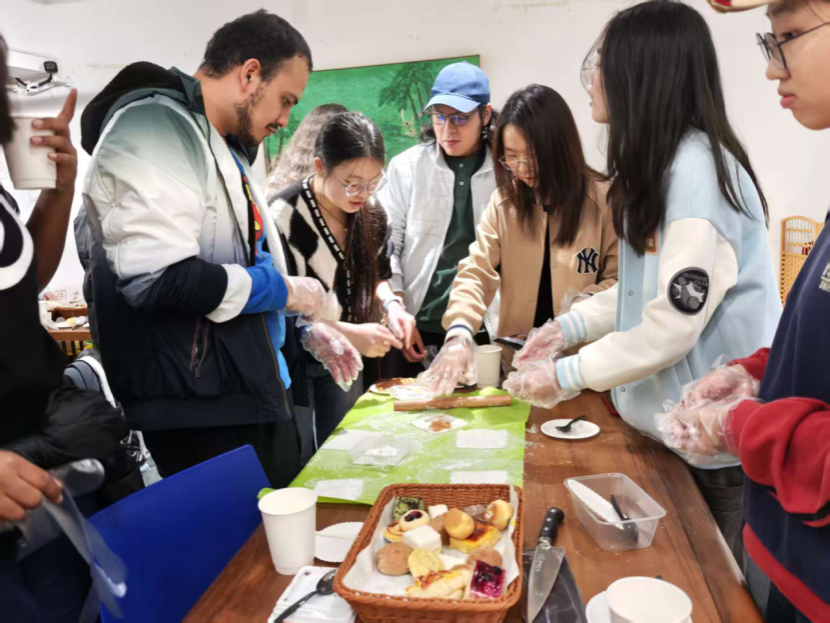 体验环节一开始,现场立刻热闹起来。同学们自然地分成几簇围在桌边,双手按上糯米面团,揉搓间反复翻转。用指尖捏取少量黄豆粉撒在案板上,将揉好的面团滚过粉末,粉粒均匀地裹在表面。几位留学生跟着示范动作,认真地捏面团,再慢慢滚动裹粉,步步复刻操作流程。大家边做边交流,不时分享技巧,欢声笑语中,文化的隔阂悄然消散。