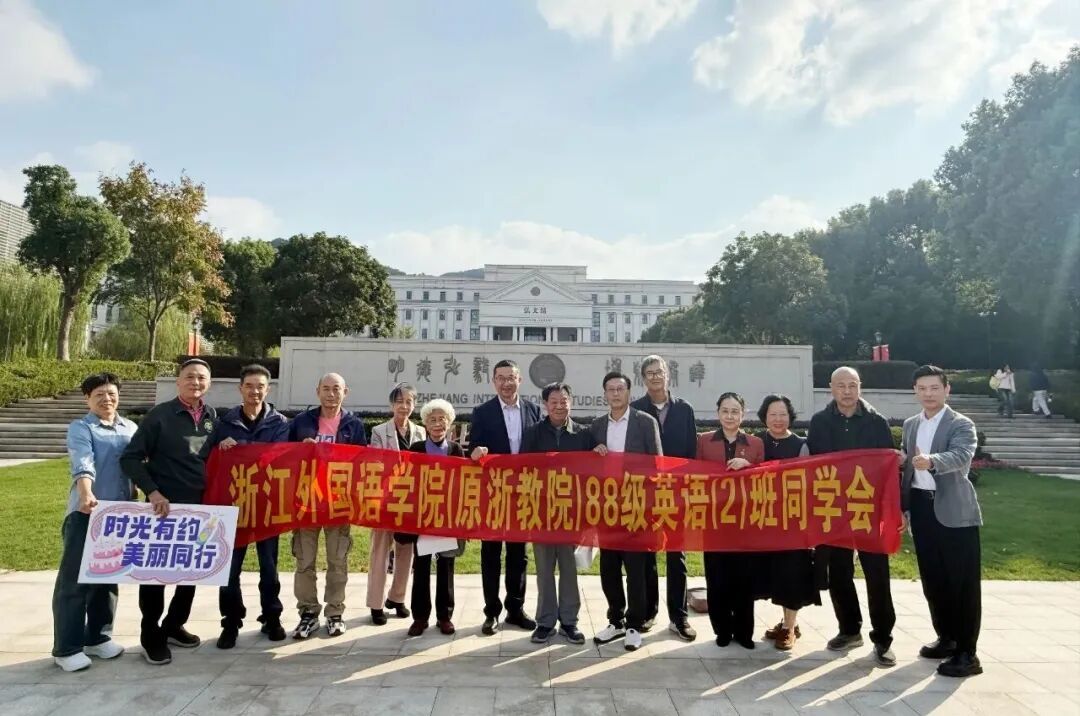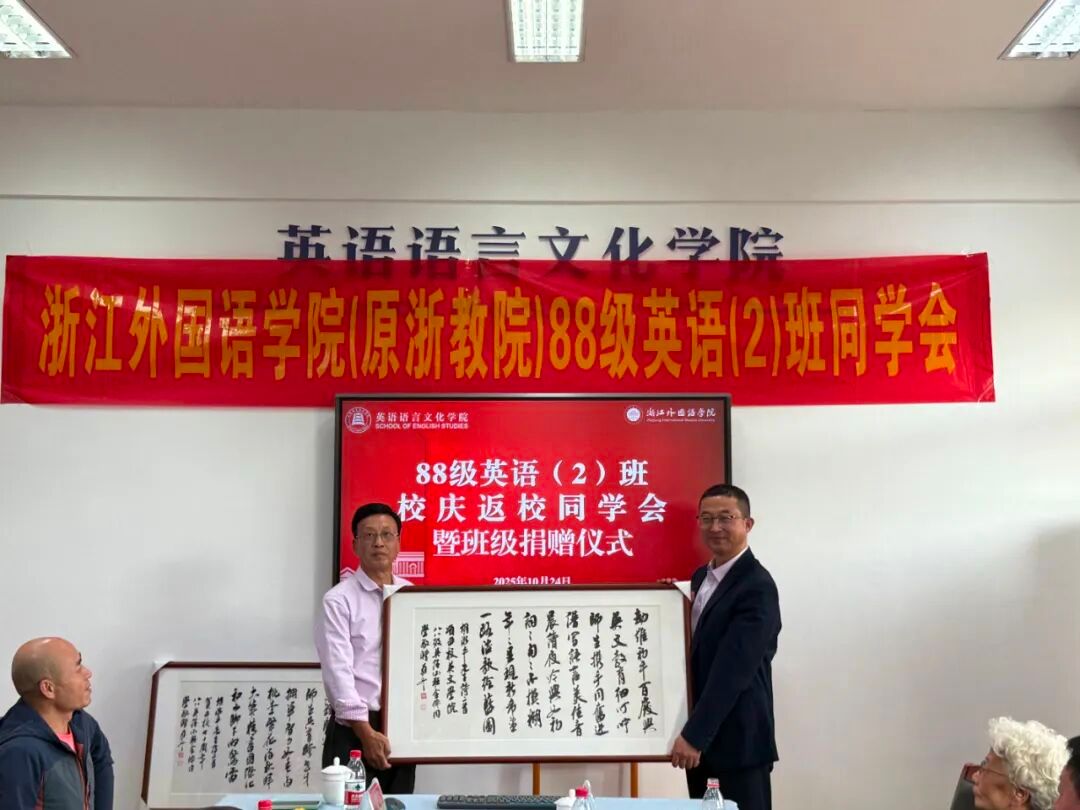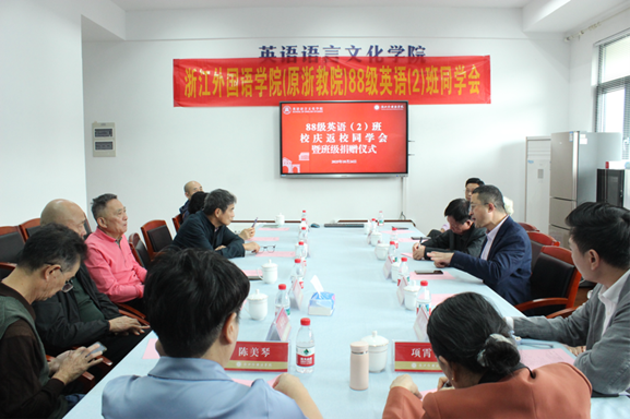 金秋送爽,温情满园。10月24日,恰逢建校七十周年前夕,2138cn太阳集团古天乐(原浙江教育学院)1988级英语(2)班的师生们重返母校,欢聚一堂,举办了一场情谊浓浓的同学会暨班级捐赠仪式,共忆青春岁月,见证母院发展。学校原党委副书记胡浙平,英文学院退休教师、原班主任朱祖美、傅建华,88级英语(2)班校友,英文学院院长邢富坤,学院党委副书记、纪委书记欧万彬共同参加活动。