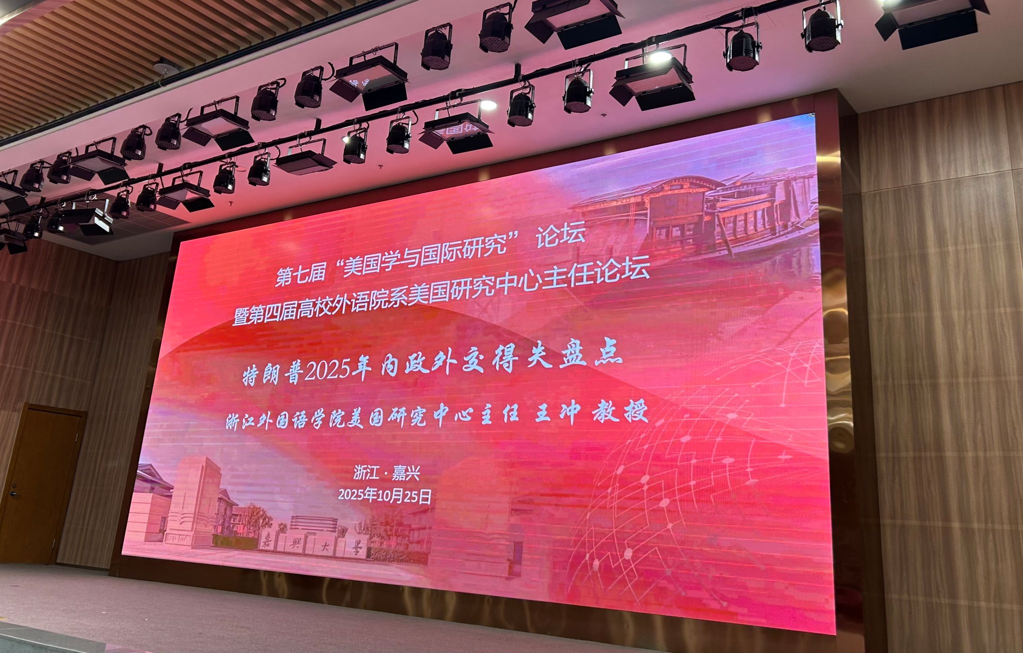 近日,第七届“美国学与国际研究”论坛暨第四届高校外语院系美国研究中心主任论坛在嘉兴大学召开。英文学院区域国别与商务英语系学科专业负责人、美国研究中心主任王冲教授应邀出席并发表主旨演讲。
