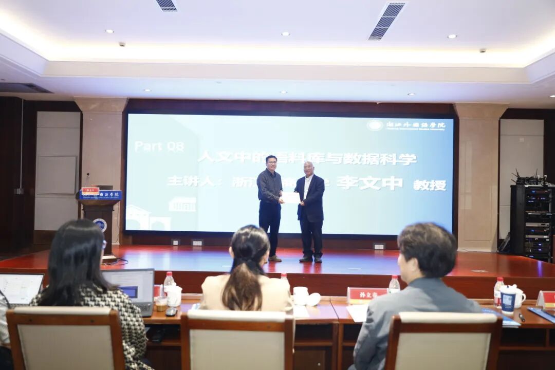 李文中以“人文中的语料库与数据科学”为题,阐述了人文社科研究的高度阐释性及其受研究者主观因素影响的特性。他指出,单纯的主观阐释难以满足可靠观察与探究的需求,而语料库语言学则能提供可验证、可复现的实证路径,成为“准科学”与桥接方法论的重要工具。语料库语言学者应作为复合型学者,以语料、数据为工具与证据,服务于人的自我理解,为人文研究注入严谨而不失人性深度的力量。报告由学会副会长,浙江科技大学樊燕龙教授主持。