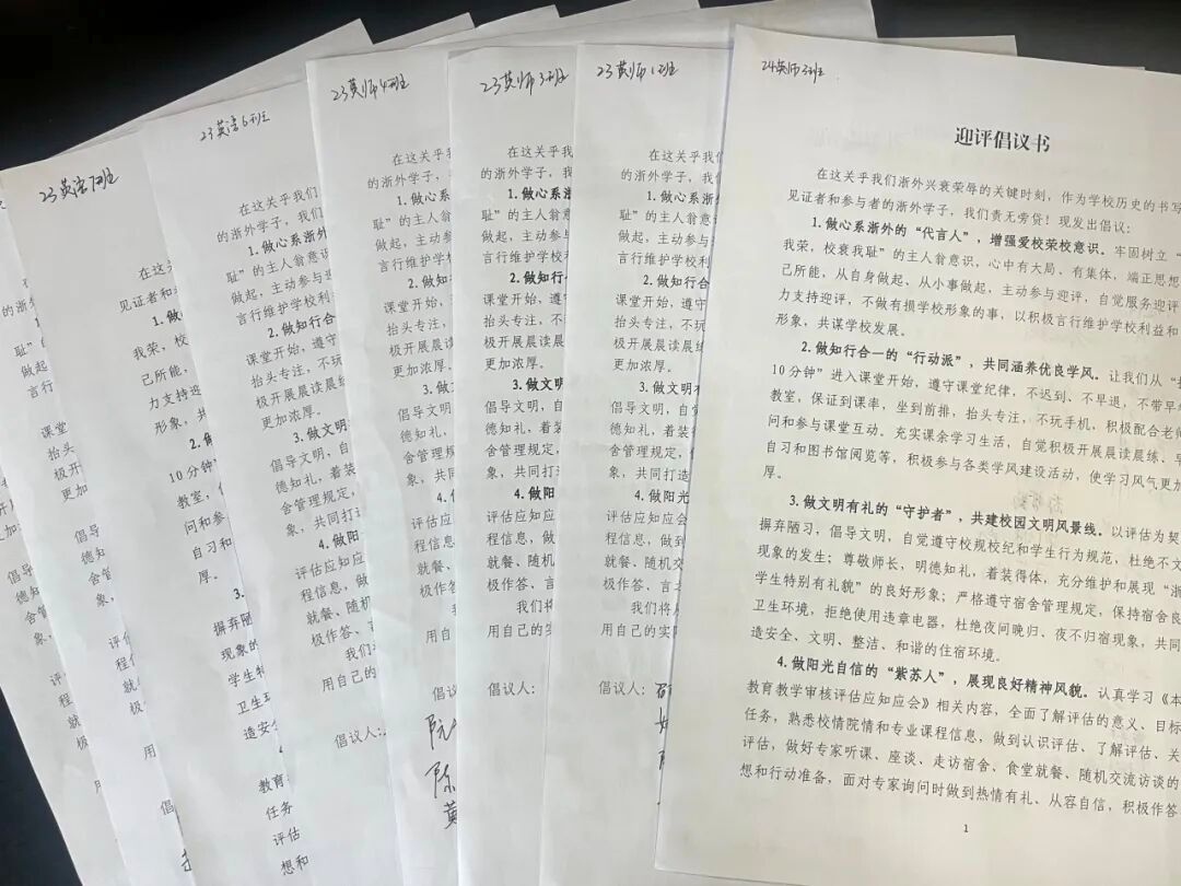 同时,为强化责任担当与行动自觉,在细致学习和充分理解后,同学们郑重地在《迎评倡议书》上签下自己的名字,以实际行动严守纪律、勤奋求学、文明修身,为评估贡献力量。
