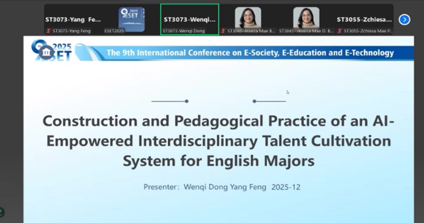我院教师冯扬及其指导的研究生董文琪应邀线上参会,并在论文宣读环节中由董文琪汇报了题为 “Construction and Pedagogical Practice of an AI-Empowered Interdisciplinary Talent Cultivation System for English Majors” 的研究成果,介绍了基于AI技术构建跨学科英语太阳集团体系的设计理念,展示了学院在人工智能与外语教育融合方面的新探索,受到了与会专家的积极关注与肯定。