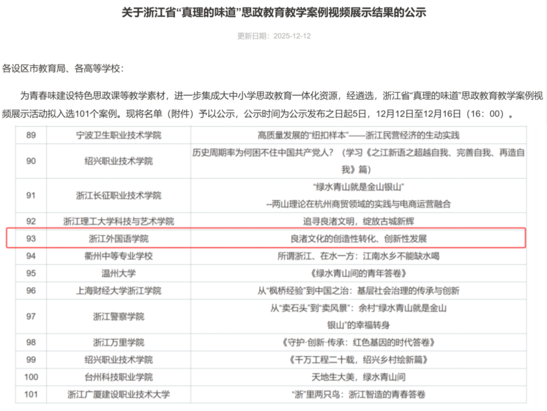 近日,浙江省“真理的味道”思政教育教学案例视频征集评选结果揭晓,由英文学院辅导员杨沁儿、顾蒙担任团队负责人,党委副书记、纪委书记欧万彬担任指导专家,23英语(师范)1班邵广妍担任团队主要成员申报的《良渚文化的创造性转化、创新性发展》教学案例成功入选,充分展现了英文学院师生在思政教育改革创新与实践育人方面的扎实探索与突出成效。