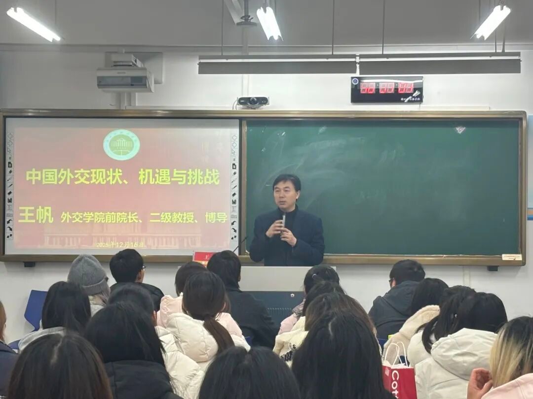 近日,外交学院王帆教授应邀作客英文学院国际关系系列讲座,以专业视角对中国外交的机遇、现状与挑战展开深度剖析与解读。英文学院党委书记田俊杰,副院长郑淑贞,学术副院长赵歆,区域国别与商务英语系学科带头人、美国研究中心主任王冲,城市国际化研究院院长、特聘教授陈溪以及2025级英语(国际关系)专业学生参加,区域国别与商务英语系章珏博士主持。本次讲座也是学院践行“四课堂联动”育人模式的一次创新实践。