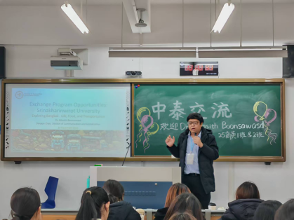 近日,英文学院顺利举办中泰文化交流活动,泰国诗纳卡琳威洛大学(Srinakharinwirot University)Dr. Attasith Boonsawasd莅临现场,与大家共同探讨泰国文化、教育特色及跨文化交际话题。英文学院学术副院长赵歆,区域国别与商务英语系陆海霞副教授及25级商务英语专业的同学们参加活动。