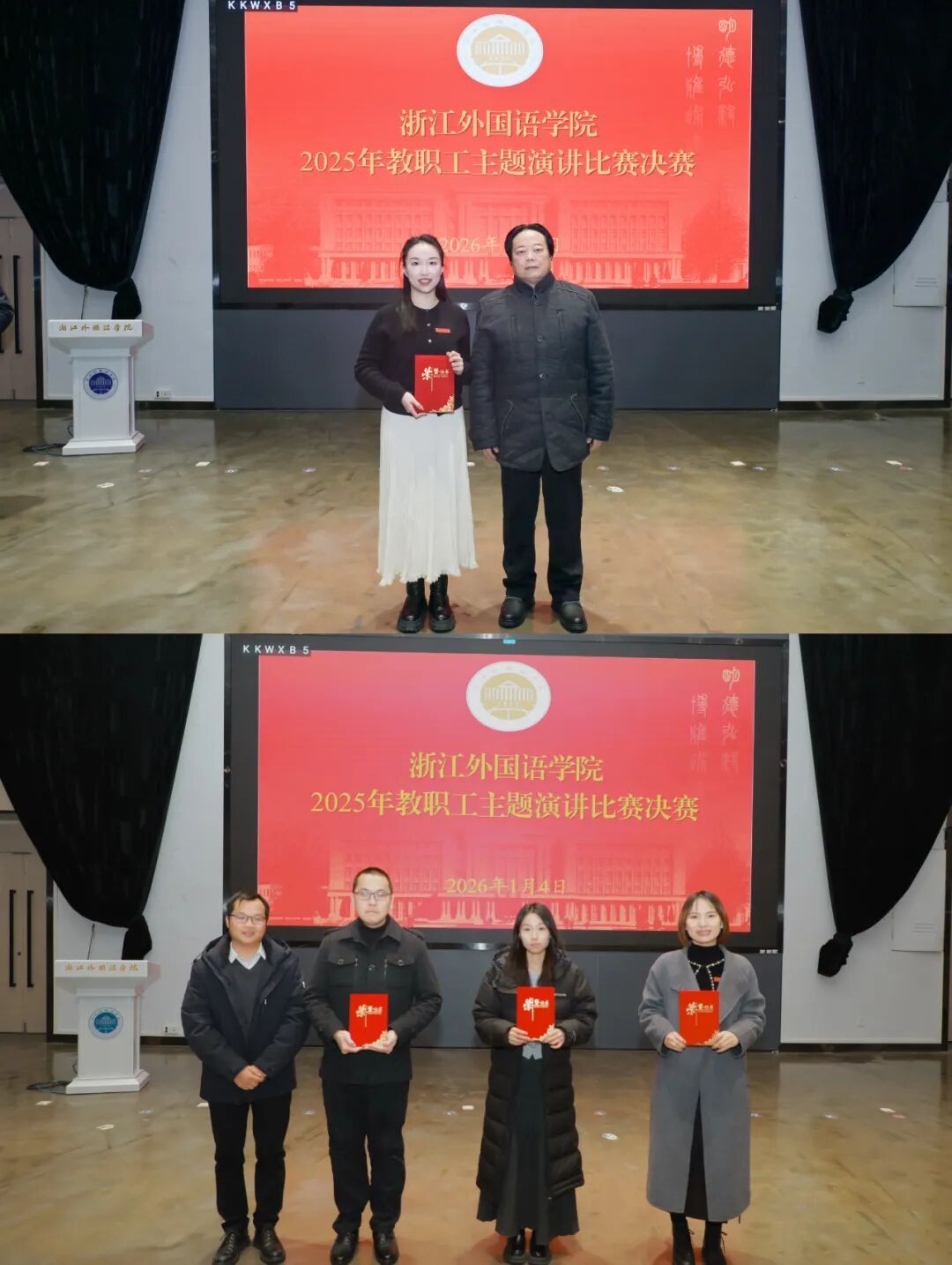 1月4日下午,学校2025年教职工主题演讲比赛圆满结束。本次比赛的主题是“传承教育家精神,笃行育人使命,筑就强国根基”。我院辅导员洪妤婷老师、张开乐老师表凭借出色的现场发挥,分别斩获一等奖与三等奖。