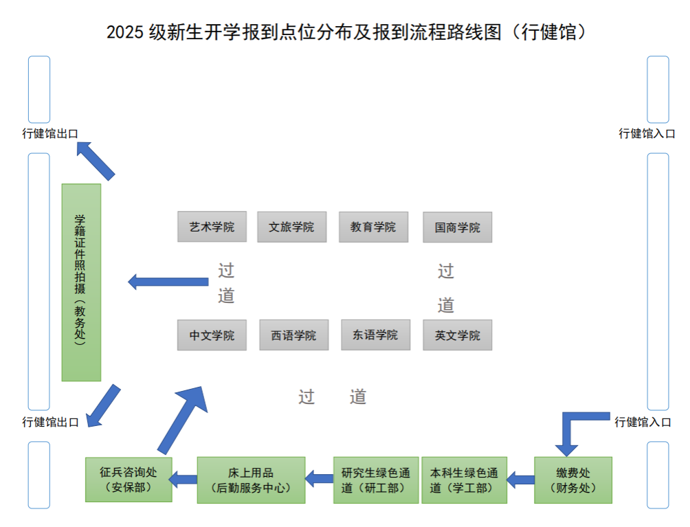 注:行健馆内实行单线行进,新生统一从入口1(南侧入口)进,入口2(北侧入口)出。