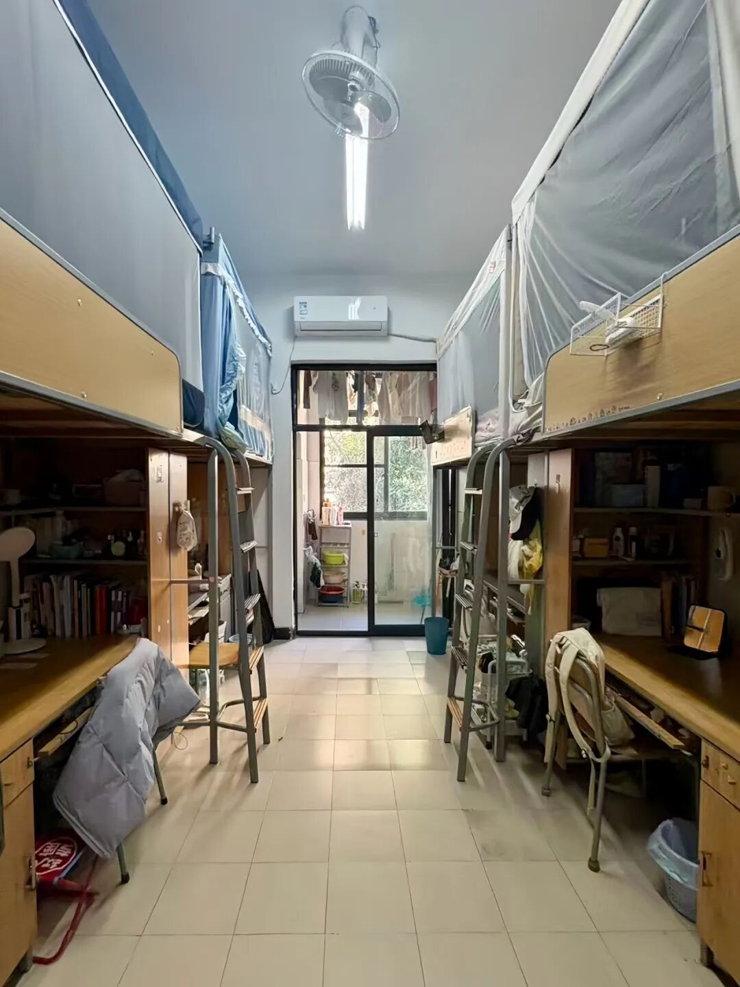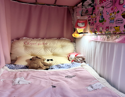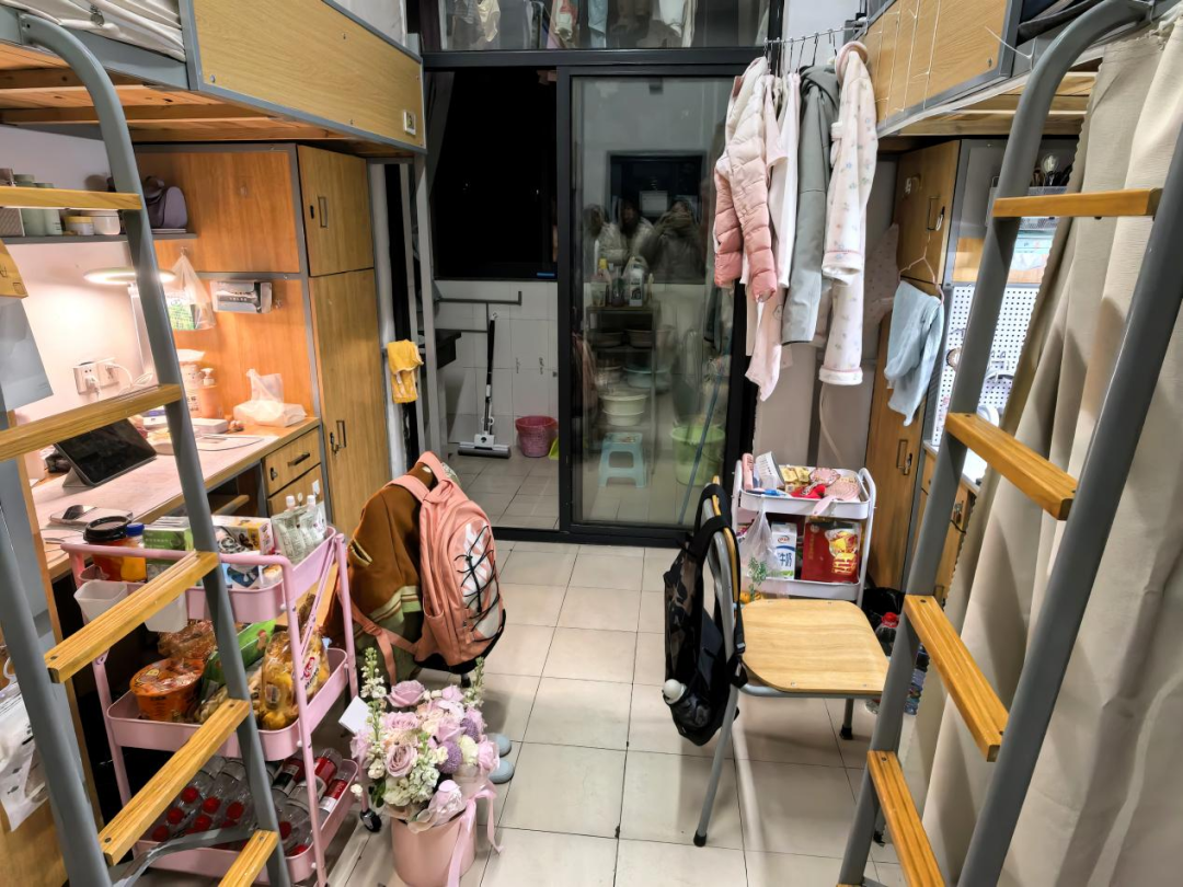 128是我们的温馨小窝:上下铺旁挂着软乎乎的衣被,书桌角落挤满可爱摆件,窗畔晒着生活气息的衣物,门上还有定期更换的鲜花。虽简约却满是暖意,是疲惫时的治愈港湾,藏着我们的日常小欢喜。