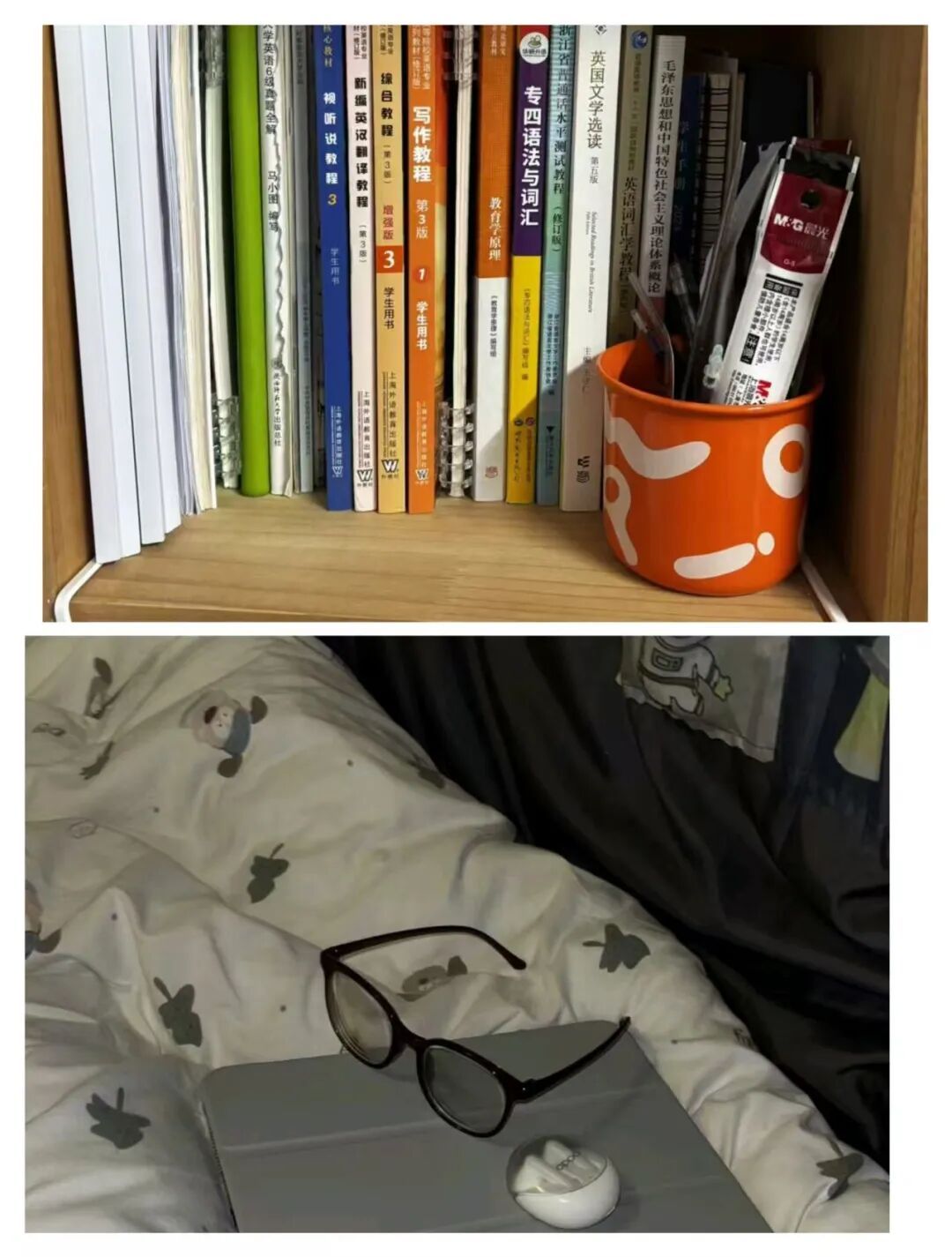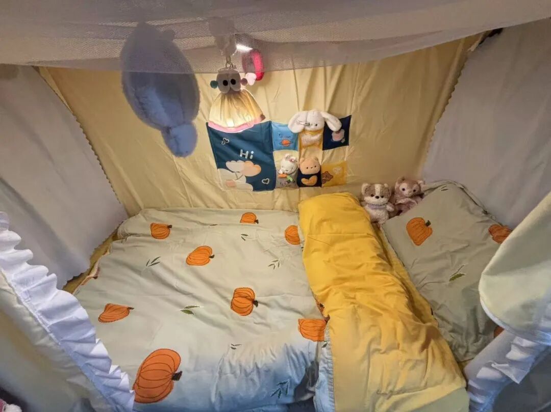 走进寝室,木质书架满载书籍与精致小物,书桌整齐有序,床上南瓜图案的床品温馨可爱。床幔点缀着可爱玩偶,书架上书籍、日用品与装饰品错落有致,展现出寝室温馨实用又不失个性的文化风采,尽显青春活力与生活热爱。