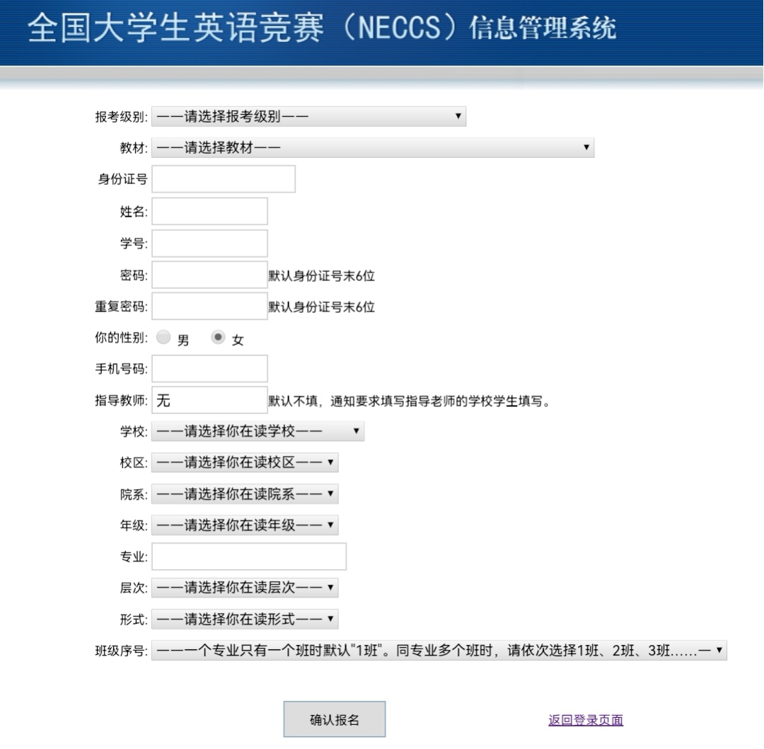 如报名信息填写错误,请进入“修改信息”栏,点击系统班级号右边的链接查询正确的系统班级号,录入空格,提交修改即可。