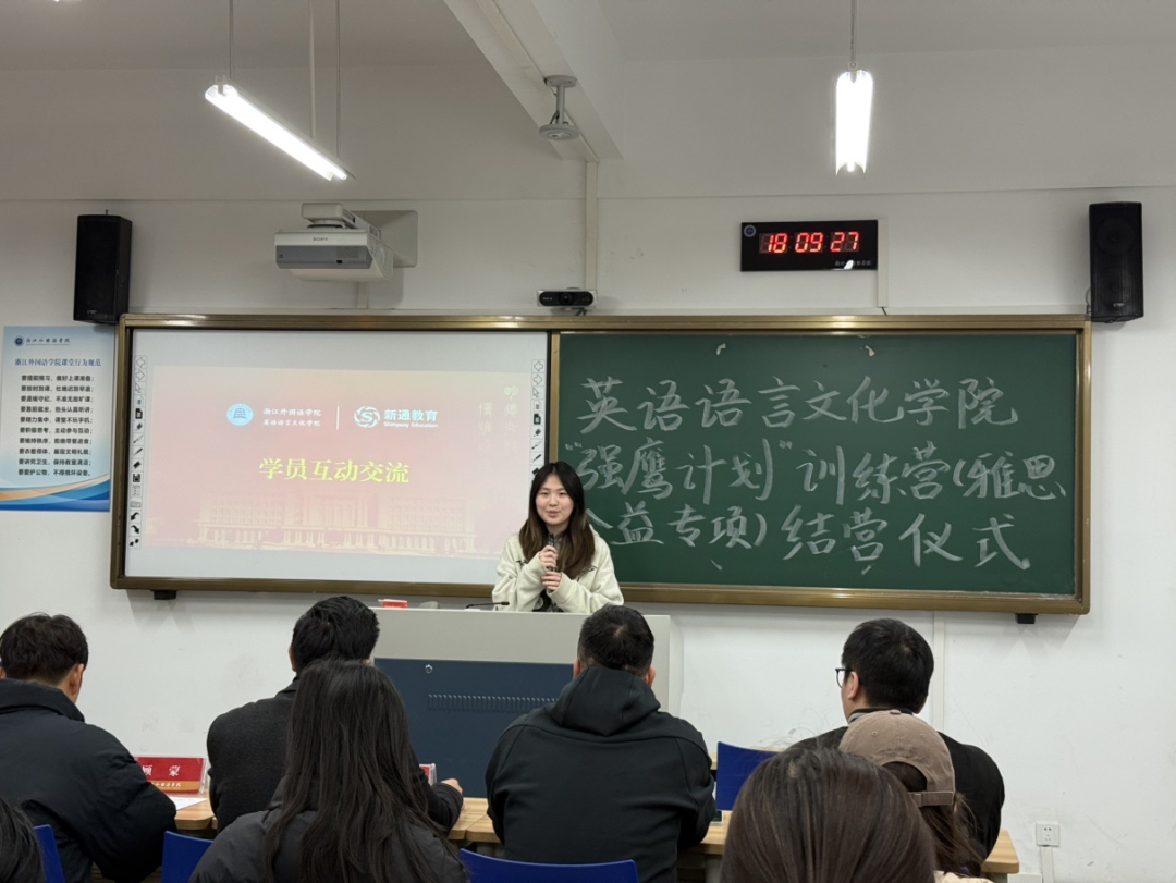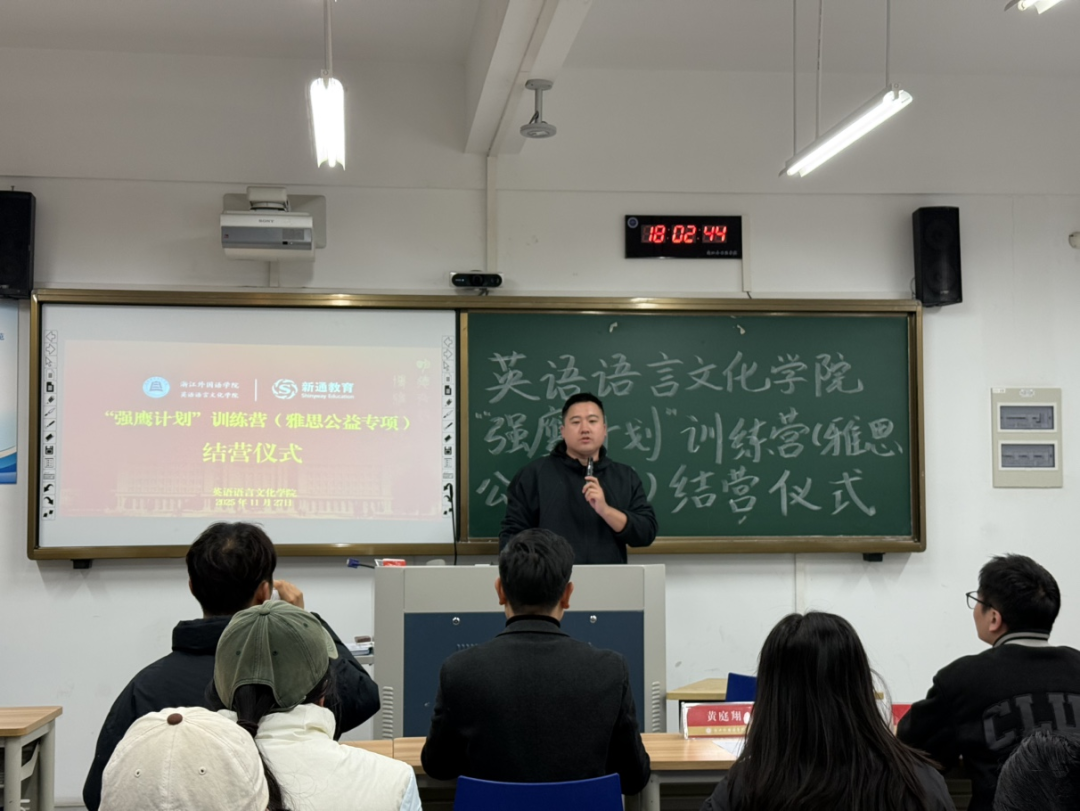 11月27日晚,英文学院“强鹰计划”训练营(雅思公益专项)结营仪式在融B104举行。新通教育杭州外语高校市场总监黄庭翔、市场代表李洋受邀出席,英文学院党委副书记、纪委书记欧万彬,2026届就业负责人吴小慧及全体训练营成员共同参与,学工办负责人顾蒙主持。
