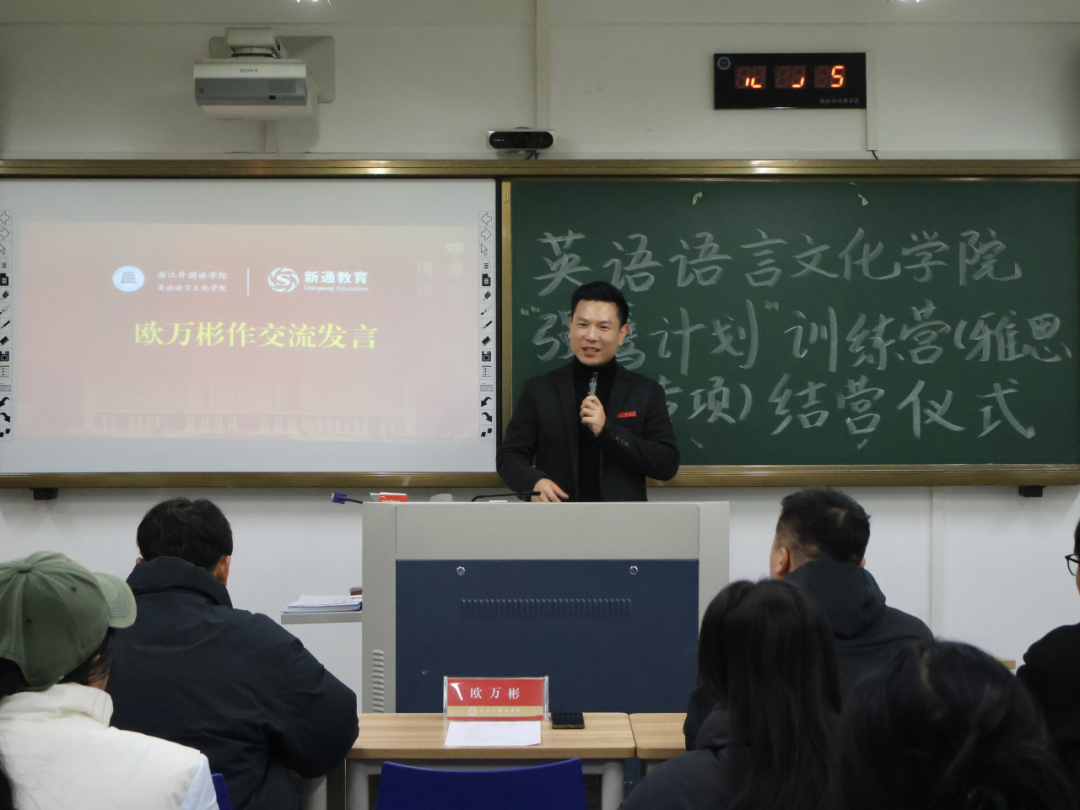 黄庭翔代表新通教育集团作总结发言,他对同学们全程踊跃参与的热情表示认可,尤其欣慰于学生在口语表达、写作逻辑等方面的显著进步。他指出首次与学院联合开展雅思公益训练营便圆满落地,印证了双方“协同育人”的共识,新通教育将持续深耕教育领域,期待与学院拓展更多合作。对于英语专业学子而言,扎实的英语能力能打开更多就业窗口,希望同学们结营后仍保持学习热情。