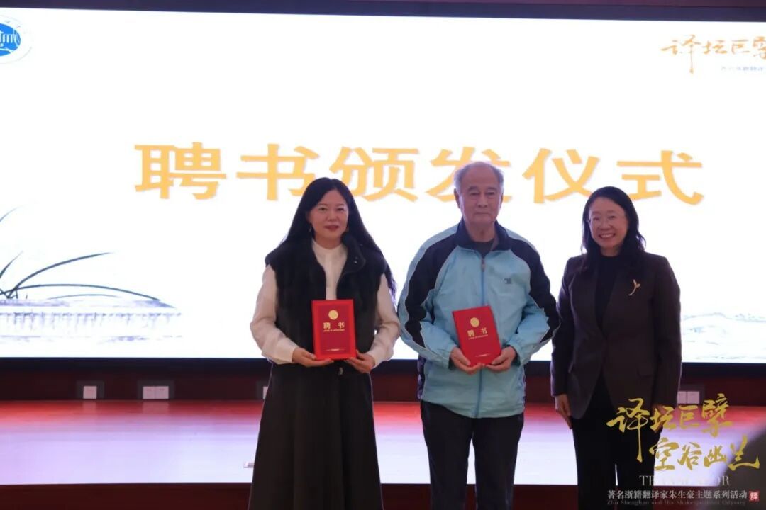 随后,现场举行了隆重的聘书颁发仪式,由英文学院院长邢富坤主持。柴改英分别为朱尚刚和朱小琳颁发聘书,正式聘请朱尚刚担任翻译与国际传播研究所荣誉研究员,聘请朱小琳担任翻译与国际传播研究所特聘研究员。