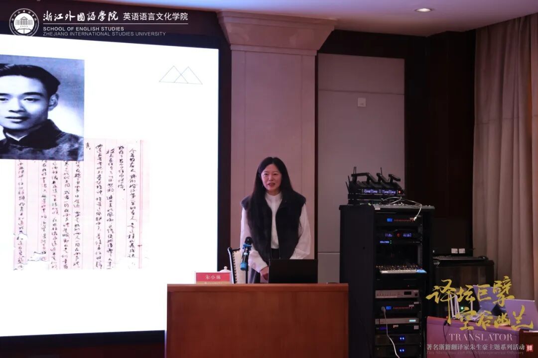 1月16日下午,“译坛巨擘·空谷幽兰”著名浙籍翻译家朱生豪主题系列活动在厚德楼102报告厅拉开序幕。朱生豪之子朱尚刚先生与夫人陈中颀,朱生豪侄孙女、中央民族大学教授朱小琳女士,杭州电视台资深媒体人李天琼等受邀参加活动。副校长、党委委员柴改英,浙江文化“走出去”协同创新中心主任、国际语言服务中心主任赵伐出席活动,来自学科办、国际交流合作处(港澳台事务办公室)等职能部门、英文学院、东语学院、西语学院、中文学院等学院领导和师生代表参加活动,共同缅怀这位“译界莎翁”的不朽功勋。