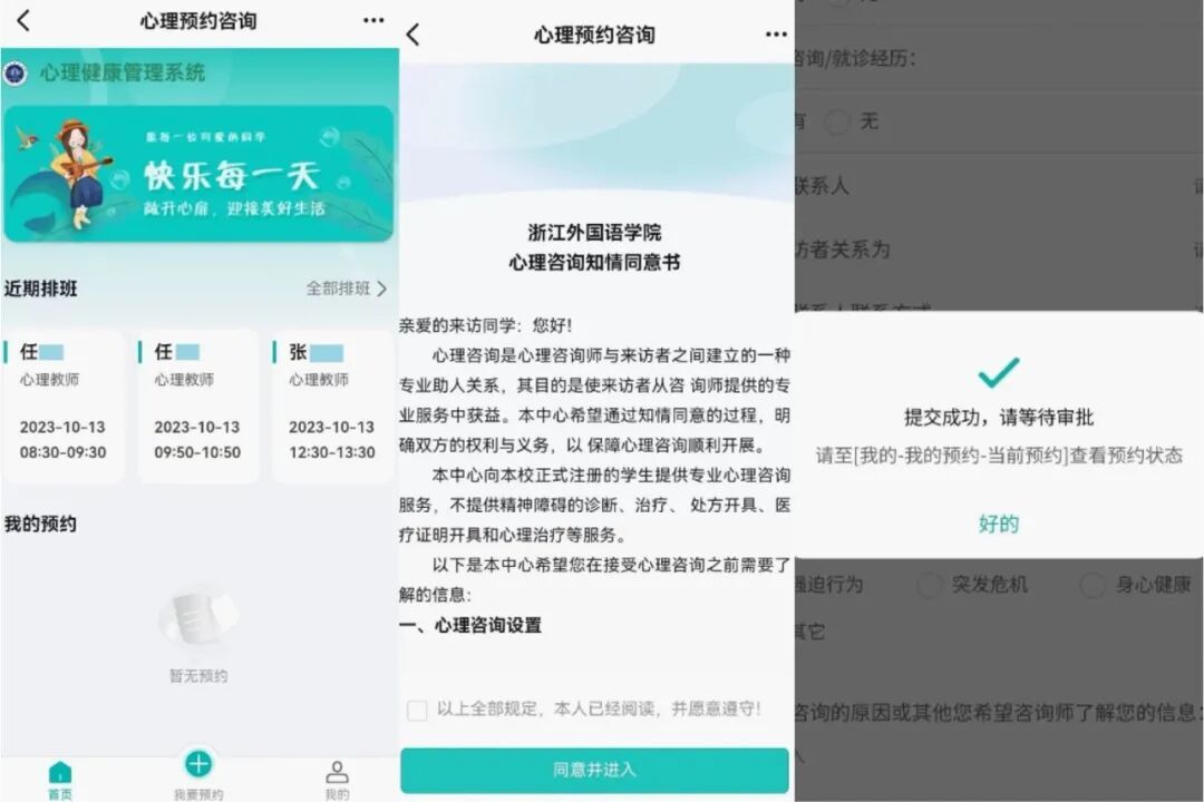 第五步,提交,提交后会有钉钉通知提醒,进入待审核阶段,管理员通过后,进入待咨询阶段,此时预约就成功啦。